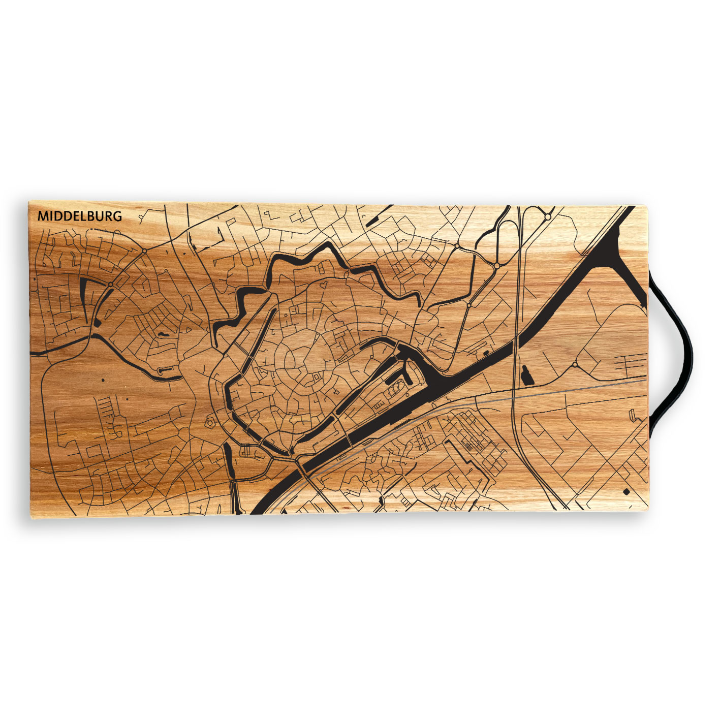De stadskaart van Middelburg gedrukt op een borrelplank. Keuze uit 3 verschillende houtsoorten; iep, eiken en esdoorn. Iep heeft een wisselende vlamwerking. Eiken is iets grover van structuur. De Esdoorn is een lichte kleur hout met af en toe een knoest. De planken zijn 39,5 cm lang. Esdoorn en Eiken zijn 18,5 cm breed en Iep is 20 cm breed.