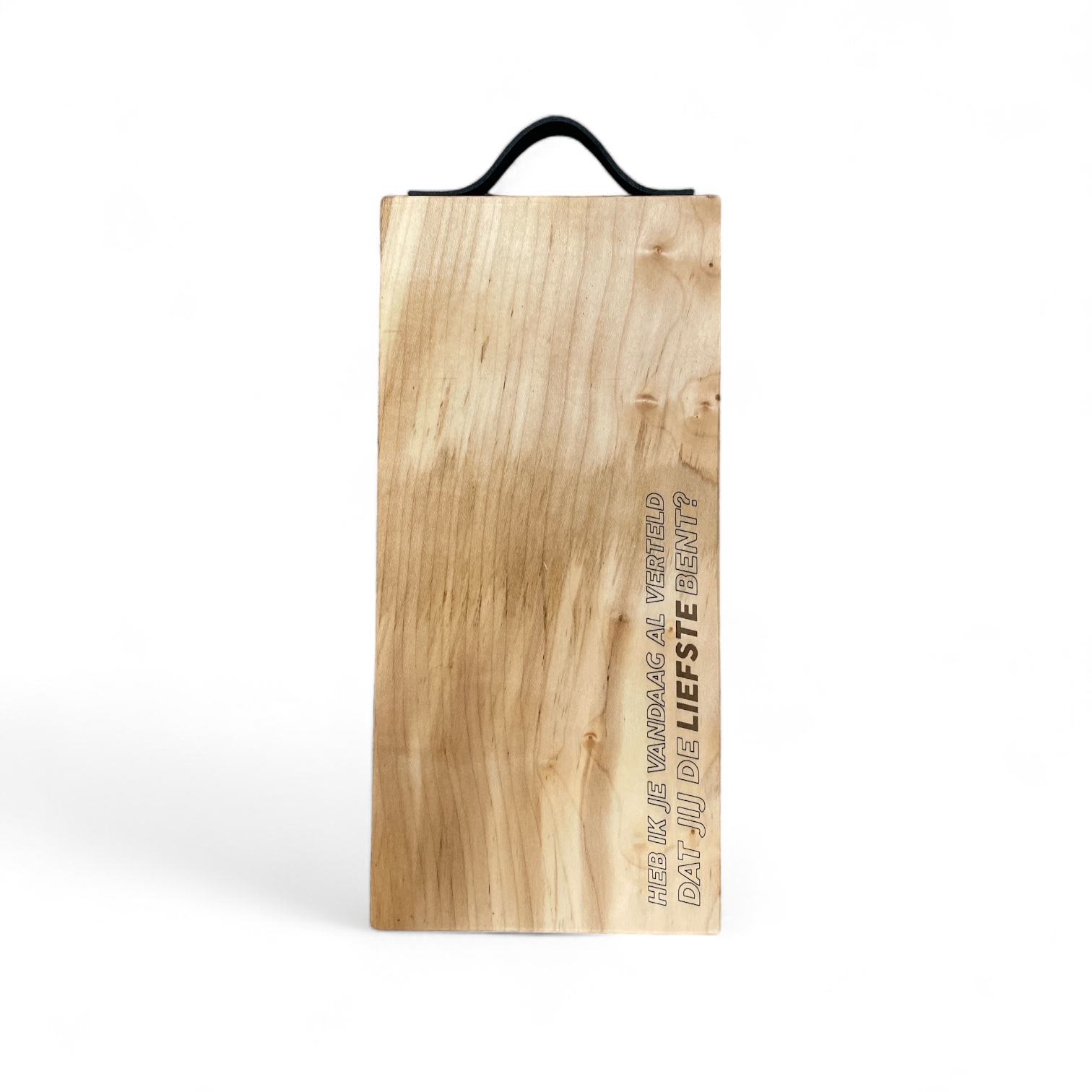 Een dikke stevige stoere plank van esdoornhout, met een gravering naar wens. Afgewerkt met een zwart lederen riempje. De plank heeft een afmeting van +/- 19 x 40 cm. Hieronder kun je je tekst of ontwerp uploaden.
