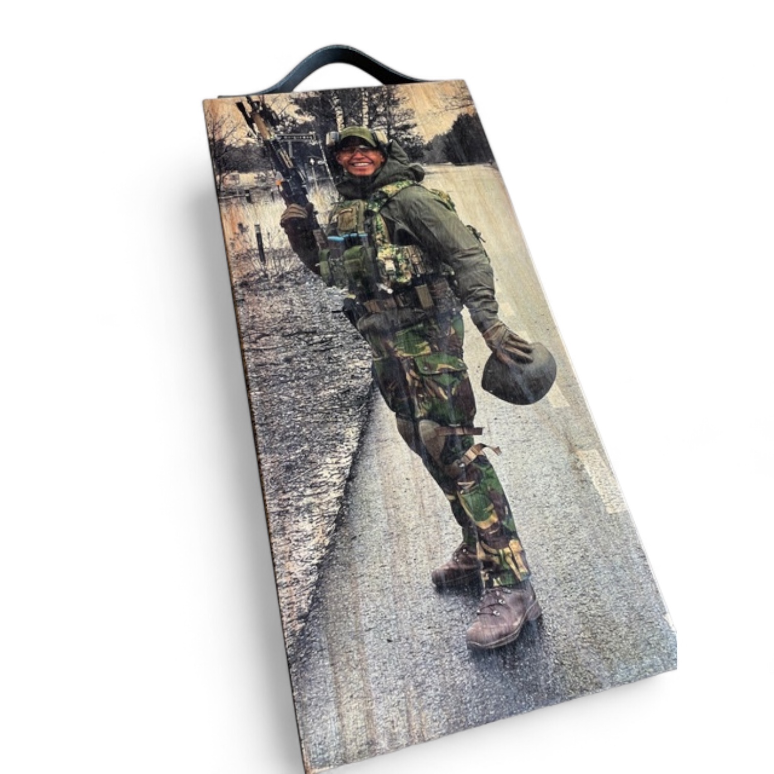 Een dikke stevige stoere plank van esdoornhout, met je favoriete foto of print. Afgewerkt met een zwart lederen riempje. De plank heeft een afmeting van +/- 19 x 40 cm. Hieronder kun je je foto of ontwerp uploaden. Liever alleen een tekst op de houten plank, dat kan ook, kies dan voor graveren.